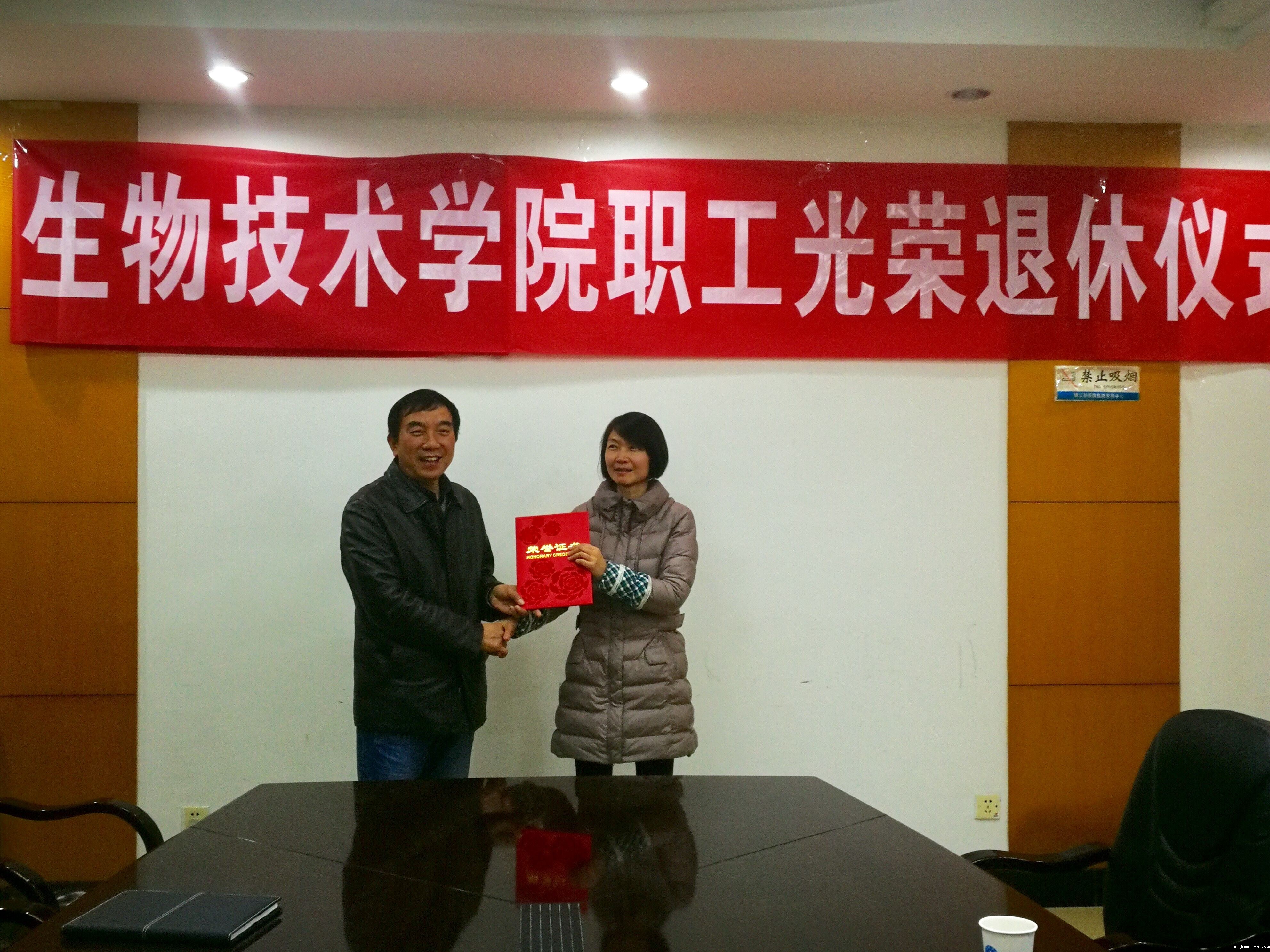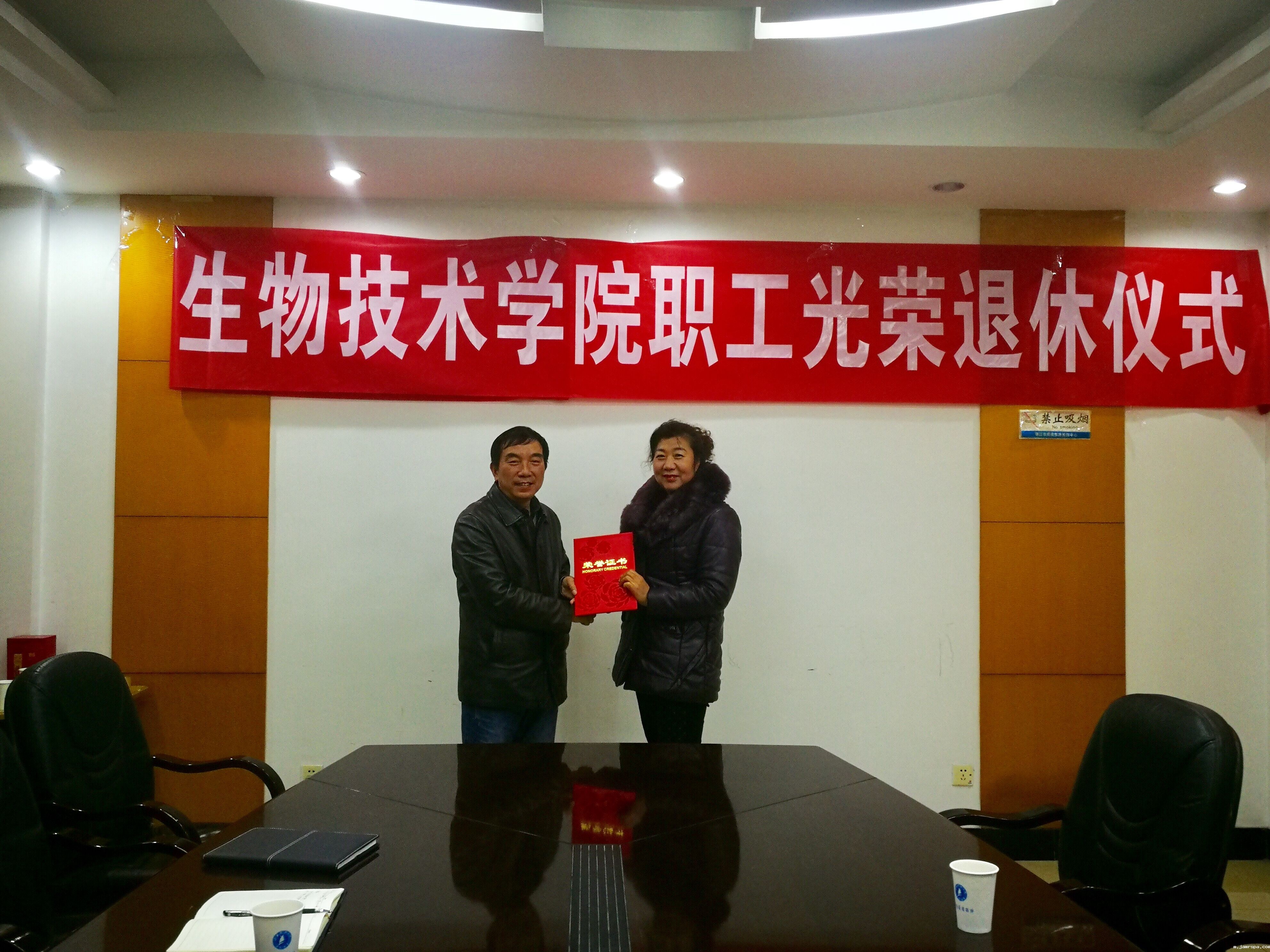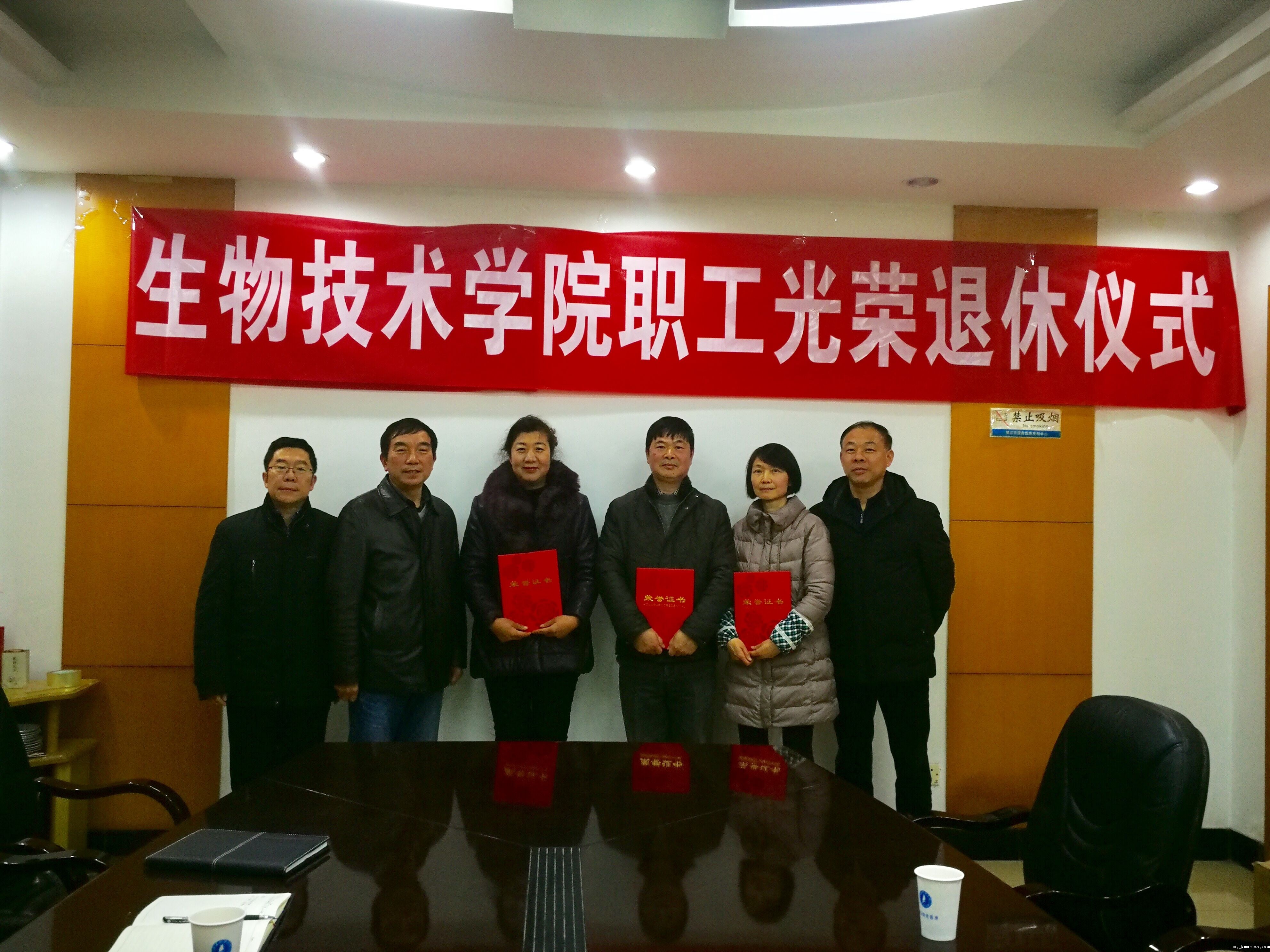202016日下午蚕研所生物技术学院党委、工会为2019年退休的三位职工王福海、吴秋明、李桂芳同志举办退休仪式。所院党委书记张国政、党委委员、办公室主任张健,工会主席康国平、工会组织委员游帅参加仪式。