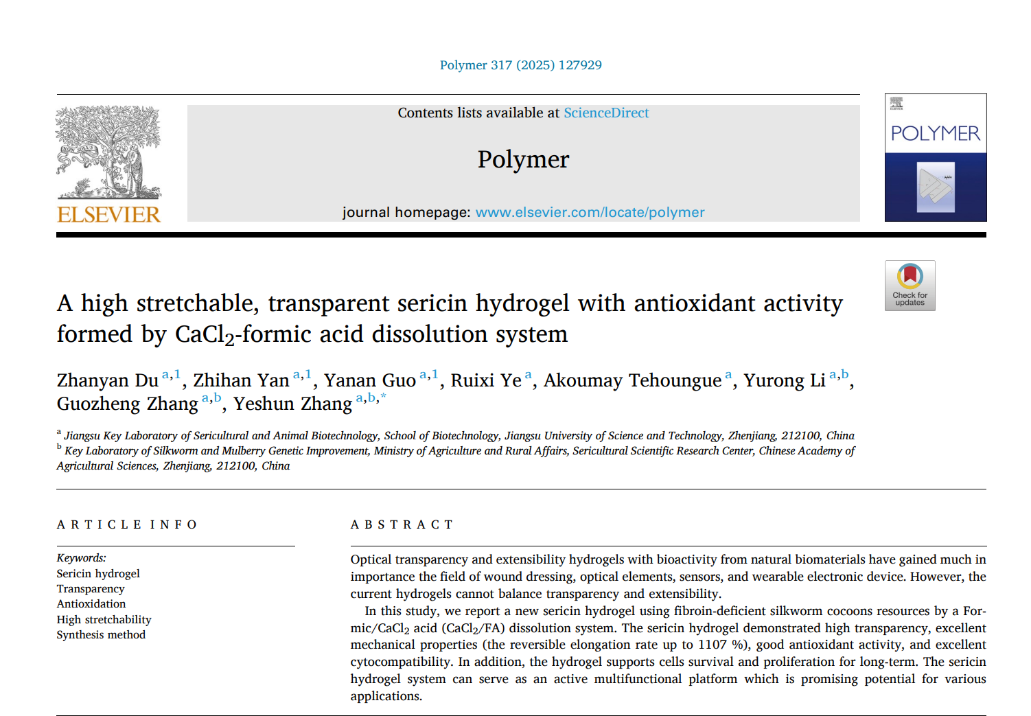 (3)在《Polymer》发表题为“A high stretchable, transparent sericin hydrogel with antioxidant activity formed by CaCl2-formic acid dissolution system”的研究论文。