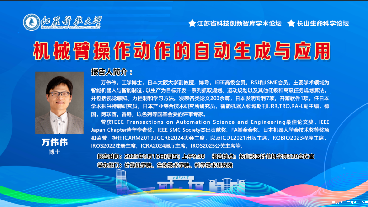 2025年5月16日上午,应计算学院束鑫教授、生物技术学院赵卫国研究员邀请,日本大阪大学副教授万伟伟做客江苏科技大学海韵智算讲坛,并为所院师生作了特邀学术报告《Challenges and Solutions of Motion Planning in Real-World Deployment》。
