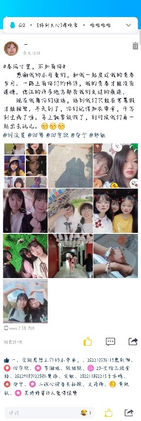 感恩是一种对恩惠心存感激的表示,是一位不忘他人恩情的人萦绕心间的情感。通过前期宣传工作,各学院同学积极参与主题活动。活动中,义工们有的用QQ空间动态@家人、老师、朋友并用文字表述一个个感人的小故事,以此表达自己的感激之情,也有用微信聊天图片合影等方式向身边人传递感恩之情