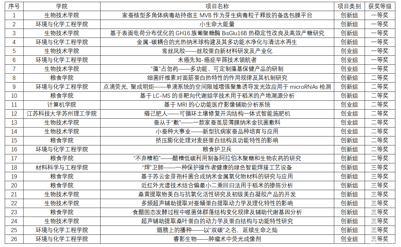 本届大赛学校共有48项作品报名参赛,生物技术学院、环境与化学工程学院、粮食学院等6个学院的参赛项目团队积极备赛,团结协作。经过网上初审、线下答辩,最终生物技术学院项目《家蚕核型多角体病毒劫持宿主MVB作为芽生病毒粒子释放的备选包膜平台》、《基于表面电荷分布优化的GH16族葡聚糖酶BisGlu16B热稳定性改良及高效产糖研究》、《鸾丝凤胶——丝胶蛋白新材料研发及产业化》、《“藻”占勿药——多功能、可定制藻基保健产品的研制》以及环境与化学工程学院项目《小生命大能量》、《金属-碳耦合的光热纳米球构建及其多功能水净化与清洁水再生》、《未癌先知-癌症早筛技术领航者》获得一等奖。