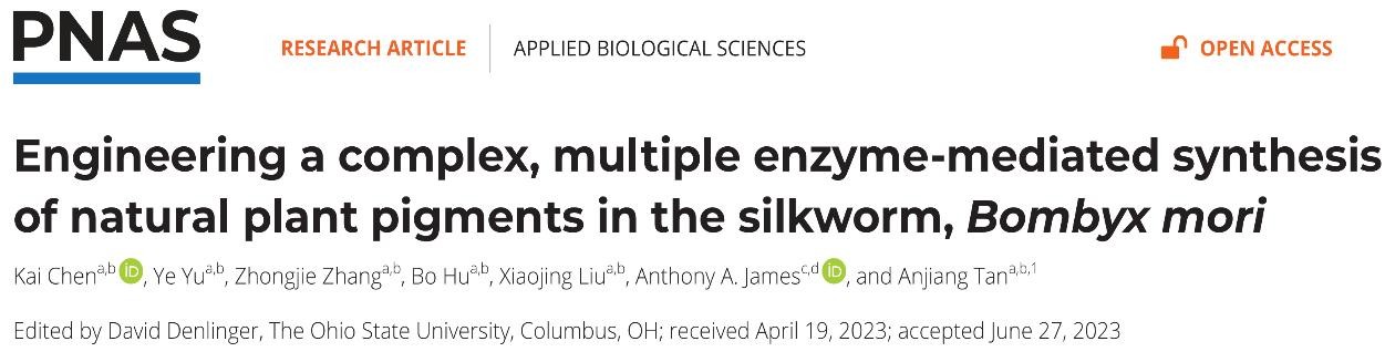 2023年8月8日,PNAS在线发表了星空体下载/农业农村部蚕桑遗传改良重点实验室谭安江团队题为“Engineering a complex, multiple enzyme-mediated synthesis of natural plant pigments in the silkworm, Bombyx mori” 的研究论文,该研究首次报道了在昆虫(家蚕)中构建天然植物化合物的多基因生物合成途径,从而高效合成一种水溶性植物色素-甜菜红素。