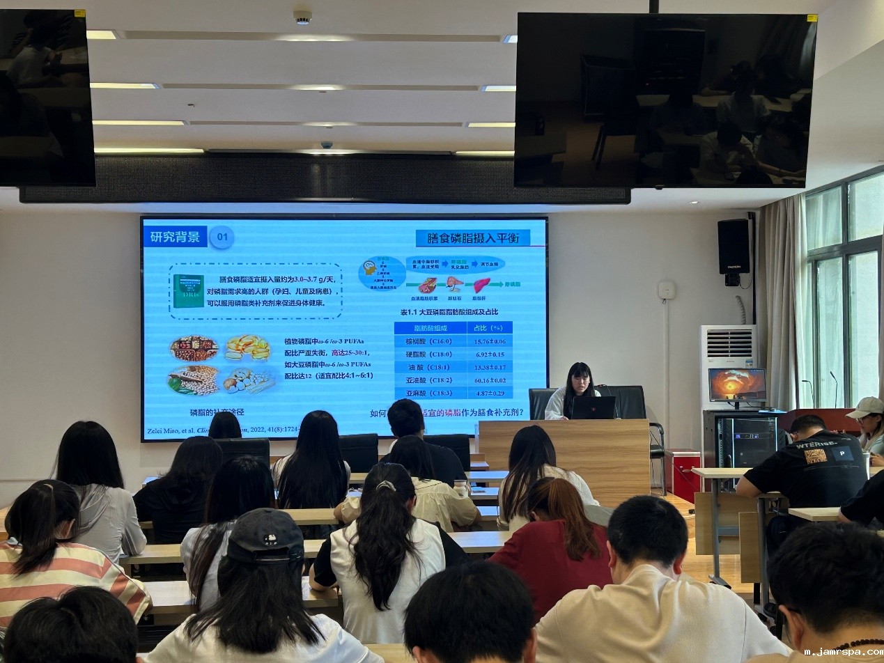 谭璐同学则以《蚕蛹源结构磷脂的超声辅助酶法合成研究》为题进行了精彩的研究成果分享,展示了她在生物合成领域的研究成果。