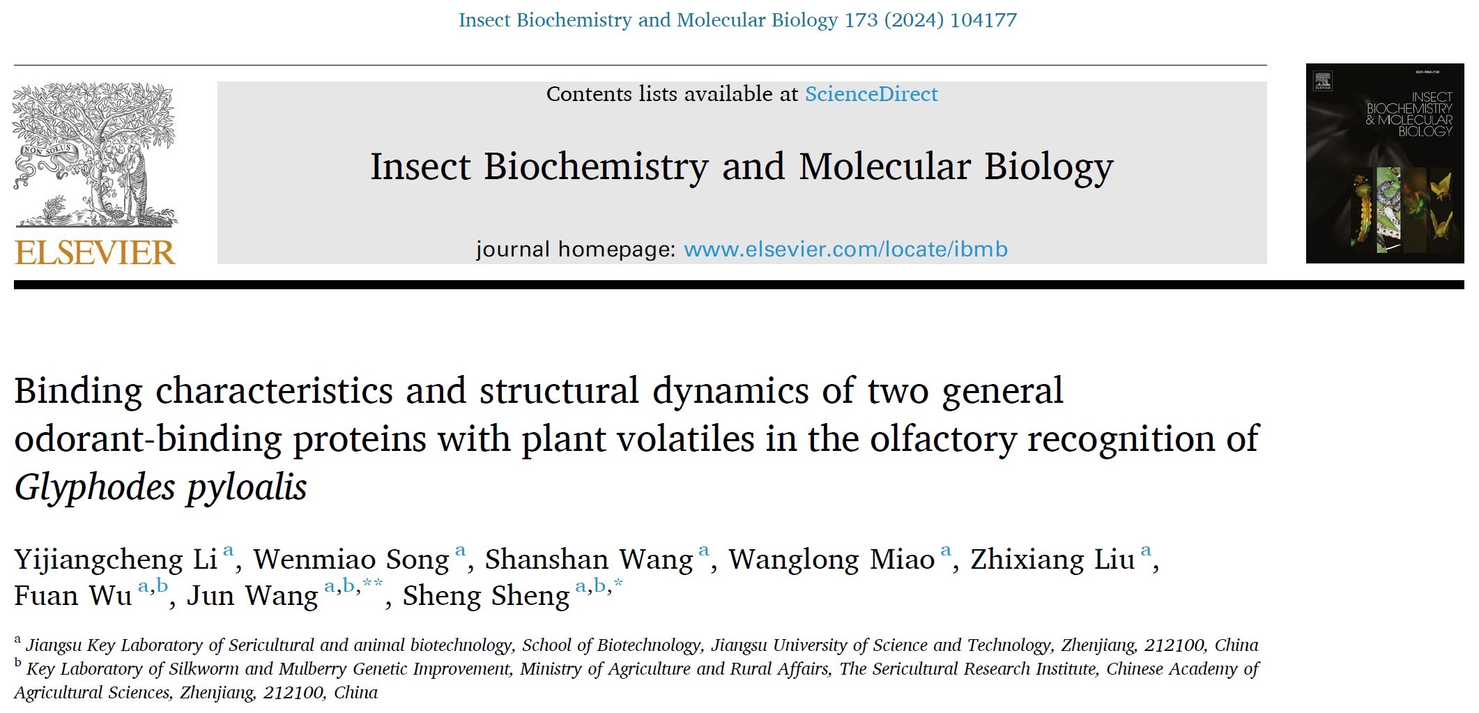 2024年8月20日,星空体下载、蚕业研究所盛晟、王俊团队在国际昆虫学领域经典期刊《Insect Biochemistry and Molecular Biology》在线发表了题为“Binding characteristics and structural dynamics of two general odorant-binding proteins with plant volatiles in the olfactory recognition of Glyphodes pyloalis”的研究论文,首次报道了我国桑树重大害虫桑螟的嗅觉识别分子机制,明确了引起桑螟嗅觉行为反应的关键靶标气味物质。