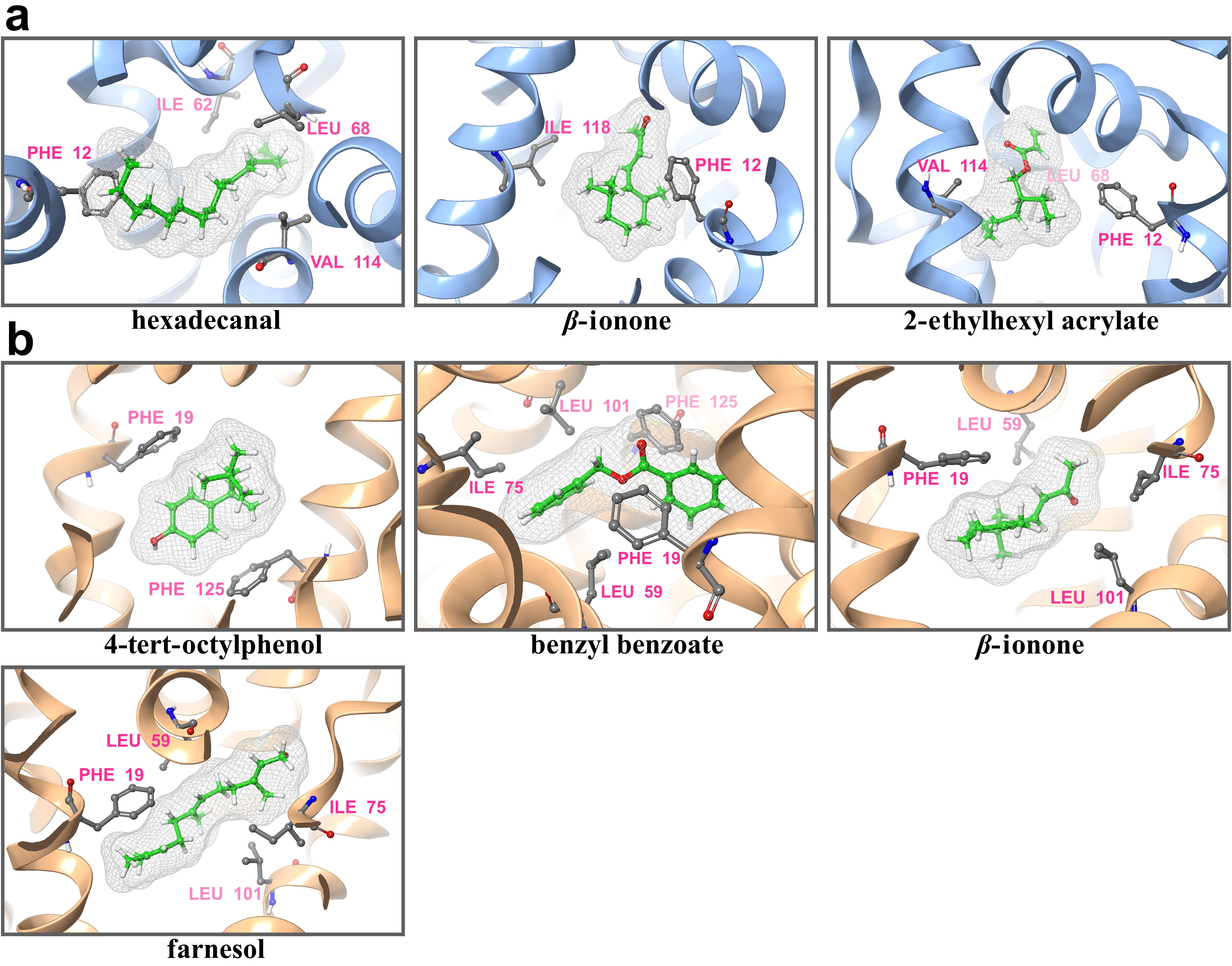 图2 GOBP1 (a)和GOBP2 (b)蛋白与候选植物挥发物的相互作用位点