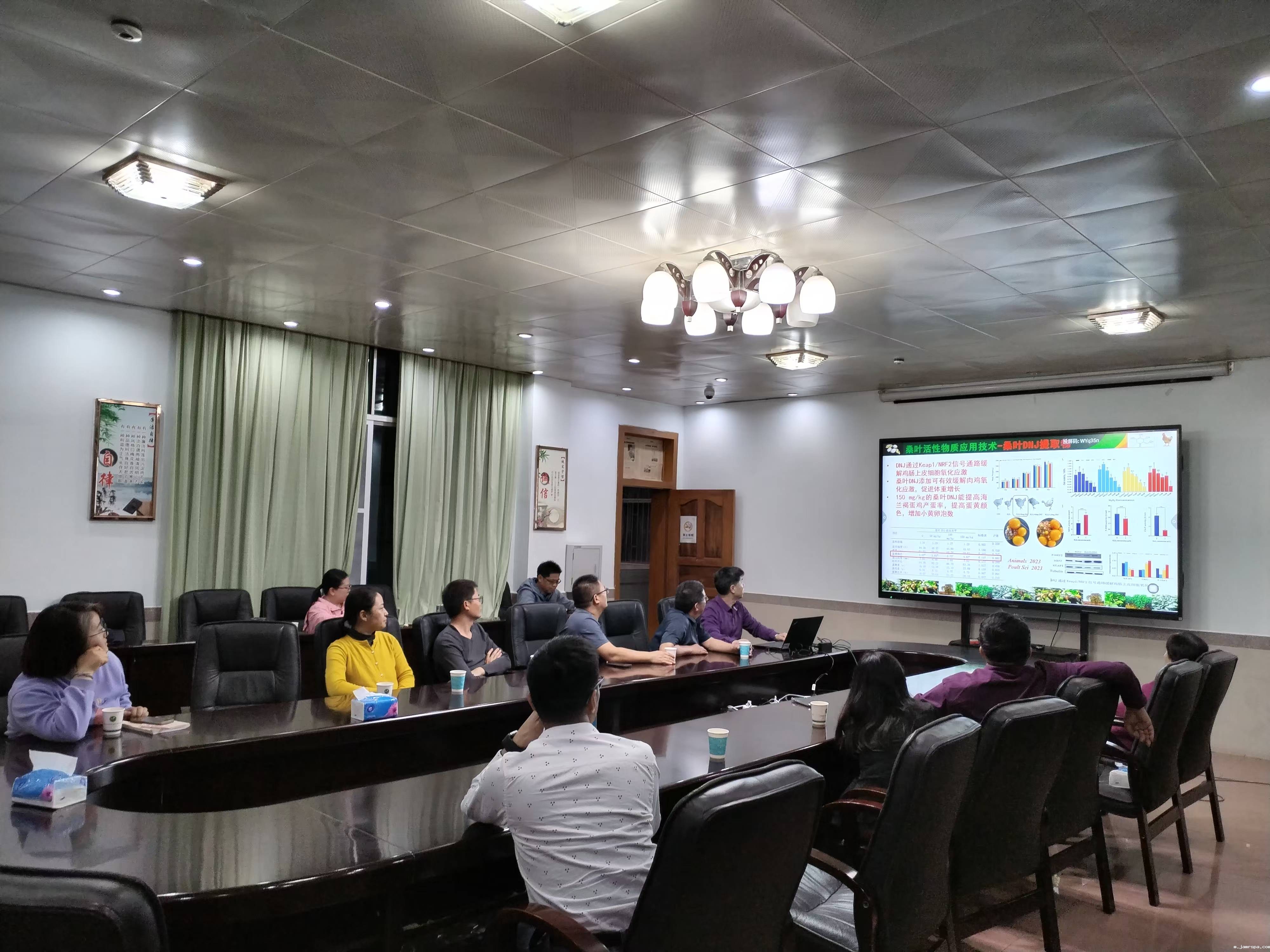 参观完毕,双方还进行了学术交流座谈。座谈会上,国家木薯产业技术体系西双版纳综合试验站站长李海泉介绍了云南省热带作物科学研究所机构设置和建所70多年以来在天然橡胶、澳洲坚果、热带水果、热带花卉、食用菌、功能植物等热区生物资源开发利用方面的开创性研究。张祖兵研究员介绍了我国辣木饲料化利用等方面的研究进展;赵卫国研究员介绍了桑树饲料化利用进展。双方认为辣木和桑树一样都含有丰富的蛋白质、钙、维生素A等营养物质,氨基酸种类及含量都比大豆丰富,均是优质的植物性蛋白质饲料源;另外,桑树和辣木中都含有药用成分,均有清热解毒、降糖降压等功效。交流会上双方希望紧密合作,进一步开展辣木和桑树的饲料化、多元化利用研发。另外,热作所位于西双版纳热带花卉园内,每年接待50余万游客,如果能在花卉园中种上桑树、饲养家蚕,开展农文旅结合的蚕桑科普,一定能吸引更多的游客;江科大拥有丰富的蚕、桑种质资源,可以提供相应的资源和技术服务,推进双方进一步合作共赢。