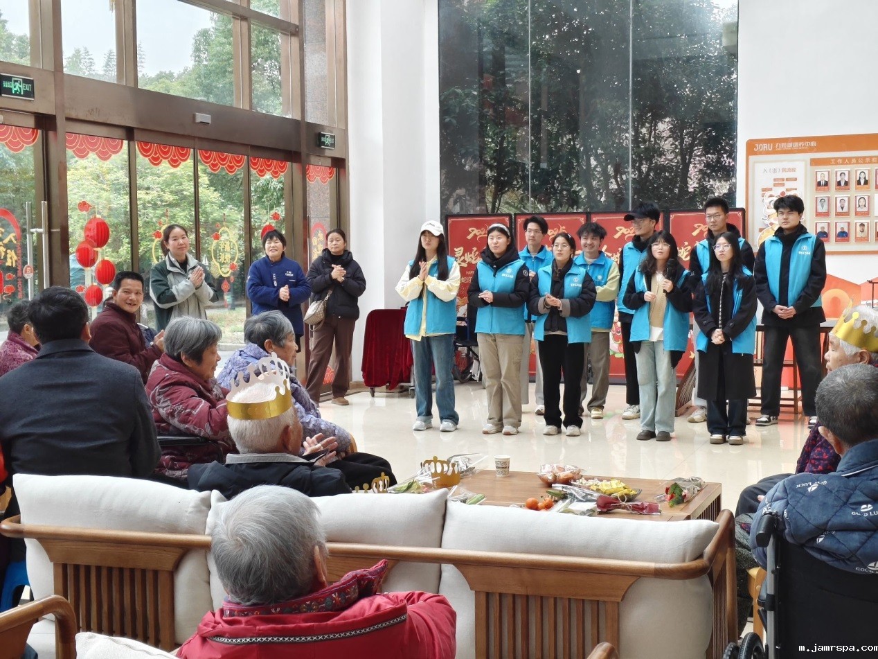 当日下午,志愿者们准时到达康养中心,他们身着蓝色马甲,脸上洋溢着青春的笑容,为养老院增添了一抹亮色。志愿者们首先与康养中心工作人员一起为三月生日的长者举行了隆重的集体庆生会。紧接着,一场精彩纷呈的文艺表演将气氛推向高潮。经典老歌《红河谷》《我的中国心》旋律响起,勾起了老人们对往昔岁月的深情回忆;学生们带来的独唱《荷塘月色》、双人合唱《踏浪》与《蝴蝶泉边》,则为现场注入了蓬勃的青春活力。而魔术表演中的奇妙瞬间,更是引得阵阵惊叹与欢呼。活动尾声,志愿者们共同合唱《难忘今宵》,老人们的灿烂笑容与热烈掌声,为这场庆生会画上了圆满的句号。
