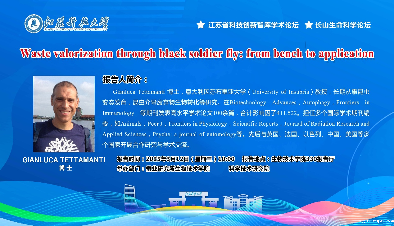 2025年3月12日上午,应蚕业研究所、生物技术学院桂仲争研究员邀请,意大利因苏布里亚大学(University of Insubria)教授Gianluca Tettamanti做客江苏省科技创新智库学术论坛和长山生命科学论坛,并为所院师生作了特邀学术报告《Waste valorization through black soldier fly: from bench to application》。
