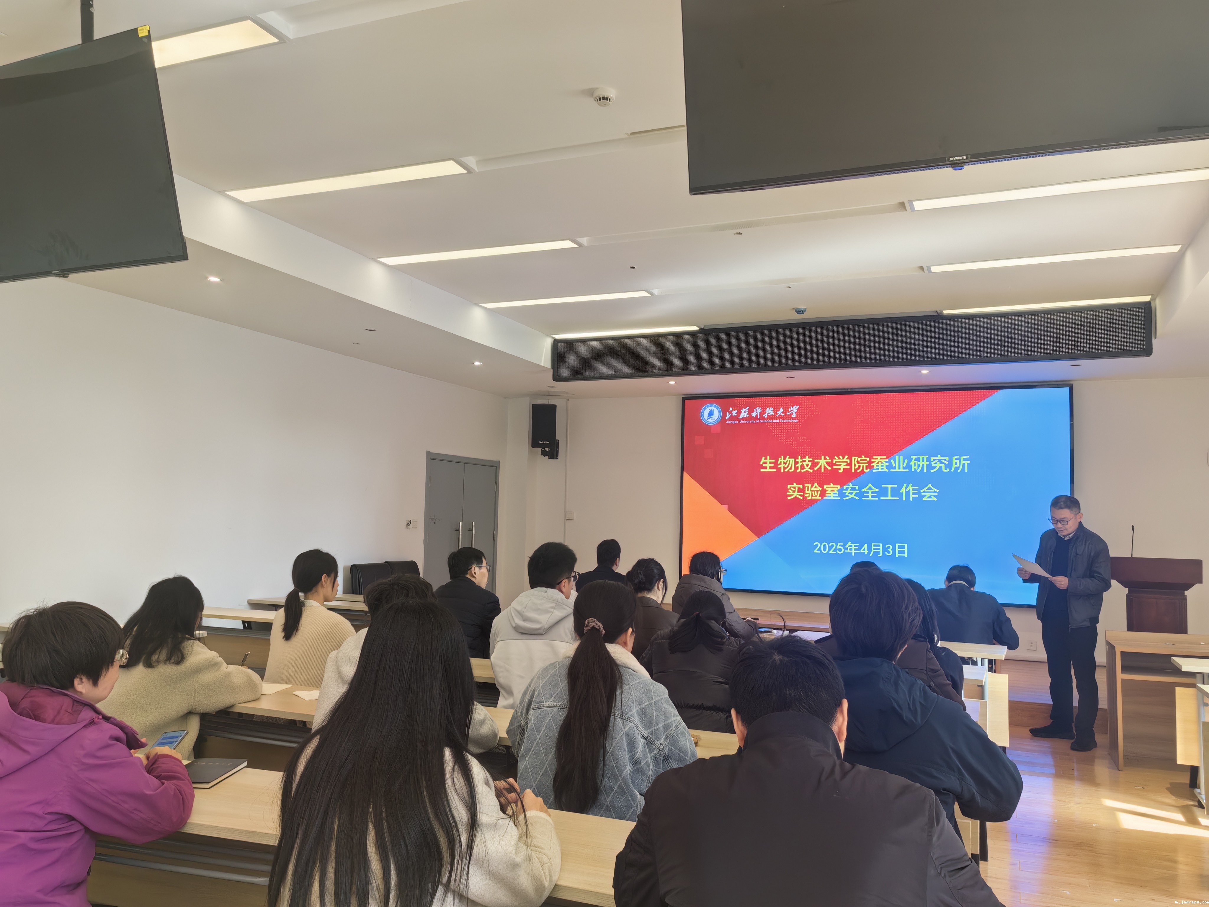盛晟对《高等学校实验室安全检查项目表(2025)》的更新情况进行了逐条解读,结合院所实验室的实际情况提出相关安全管理要求。刘挺就《江苏科技大学实验室安全分级分类管理办法》(修改稿)中的实验室安全分级表和实验室安全风险评价表的相关内容进行解读,指导开展实验室的分级分类。尤在芝就危化品申购、存贮、规范配制试剂的标签、危废处理等环节的相关要求进行了介绍。陶士强就危险压力容器使用和管理规范进行了介绍。