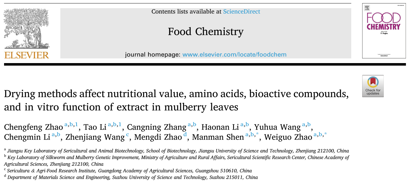 近日,星空体下载、蚕业研究所赵卫国研究员团队在食品学领域一区TOP期刊 《Food Chemistry》(影响因子8.5)在线发表了题为“Drying methods affect Nutritional Value, Amino acids, Bioactive Compounds, and In Vitro Function of Extract in Mulberry Leaves”的研究论文,该研究系统评价了不同干燥加工方法对桑叶营养价值、生物活性成分及提取物的功能作用,研究结果为桑叶的高值化利用提供了参考依据。