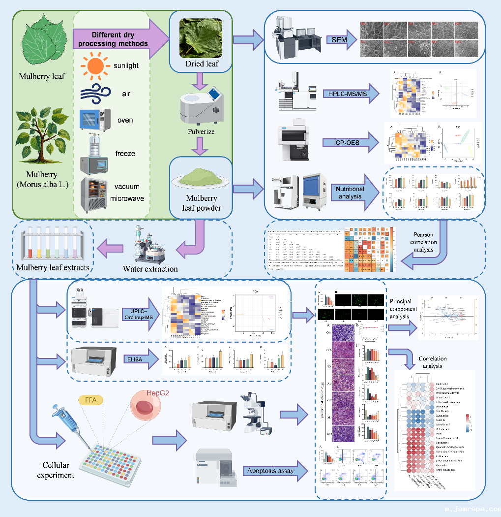 研究基于桑叶应用的限制因素,系统地分析了晒干、风干、烘干、冻干以及真空微波干燥方式对桑叶营养成分(蛋白质、脂肪、碳水化合物、矿物质)、生物活性成分(氨基酸、多酚、黄酮)及其提取物体外抗氧化和降脂效果研究。结果发现,烘干对氨基酸的保存最为有效,而冻干是保留大多数常规营养物质的最佳方法,真空微波干燥在保持矿物质和生物活性化合物方面表现最佳。不同干燥方式提取物体外功能实验表明由真空微波干燥获得的提取物对高脂诱导的HepG2细胞表现出较好的降低脂质代谢、氧化应激和凋亡水平。本研究首次系统评估了不同干燥方法对桑叶提取物营养成分和生物活性的影响,为食品、医药及饲料领域不同桑源性产品的生产应用提供了科学依据,促进桑资源的高值化利用。
