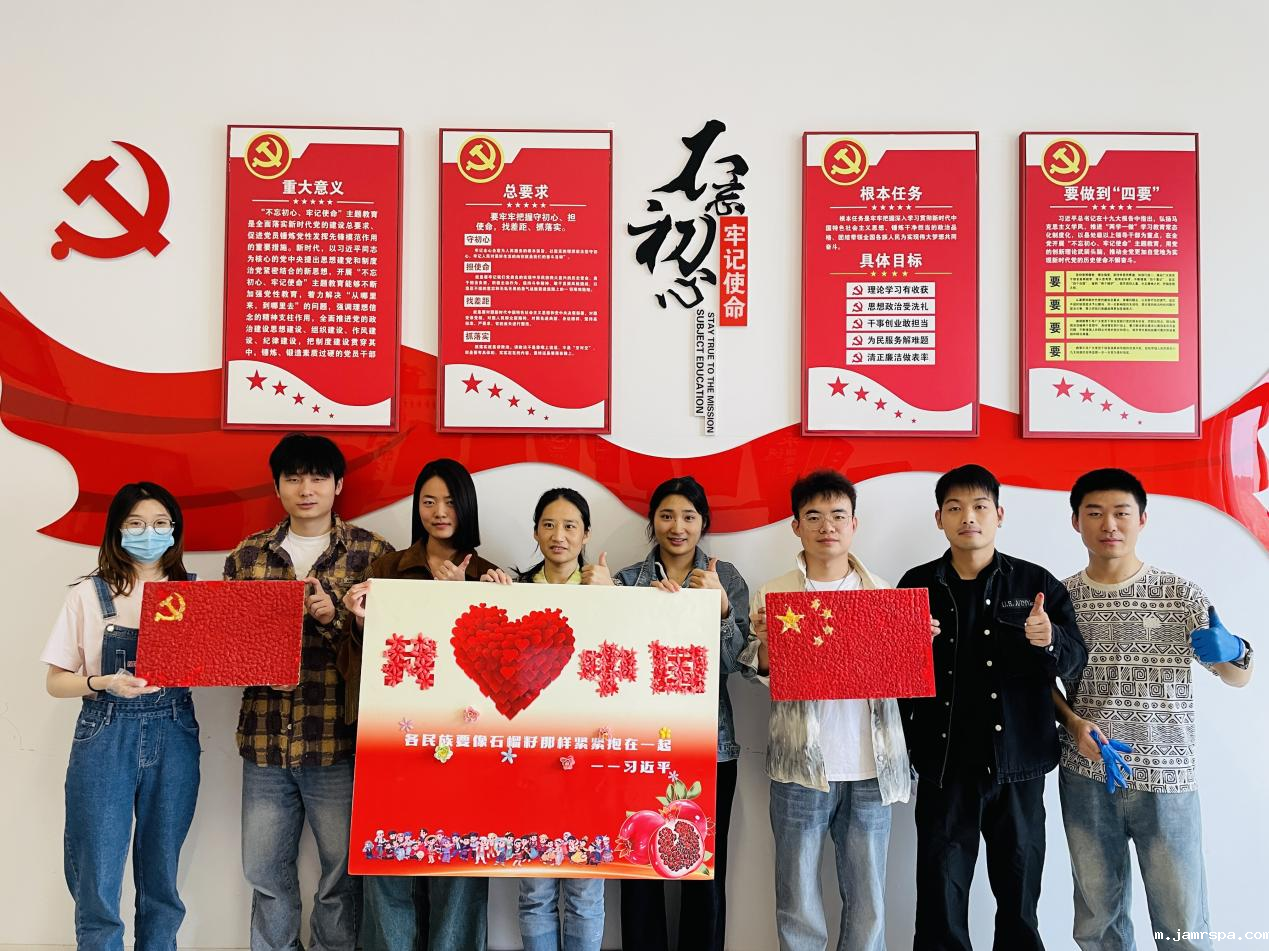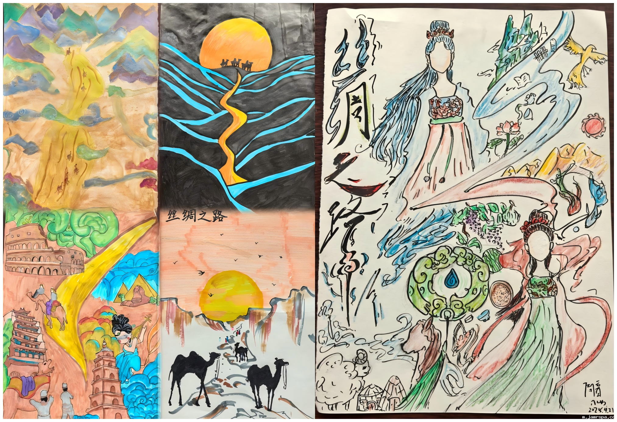 4月22日,在闻燕老师指导下,两个支部的党员和金山实验学校学生以“增进民族团结”为主题共同制作了蚕茧拼画。百余枚蚕茧化作“石榴籽”,嵌入中国地图、五星红旗等作品中,蚕茧工艺与红色教育相融合,让民族团结的种子在更多人心中生根发芽。金山实验学校党支部书记沈建勤为蚕茧拼画--中国地图题字,“各民族要像石榴籽那样紧紧抱在一起”!金山实验学校的学生们还绘制了“我家附近的丝绸之路”,传递青少年对民族团结、家国文化的认同与自豪。
